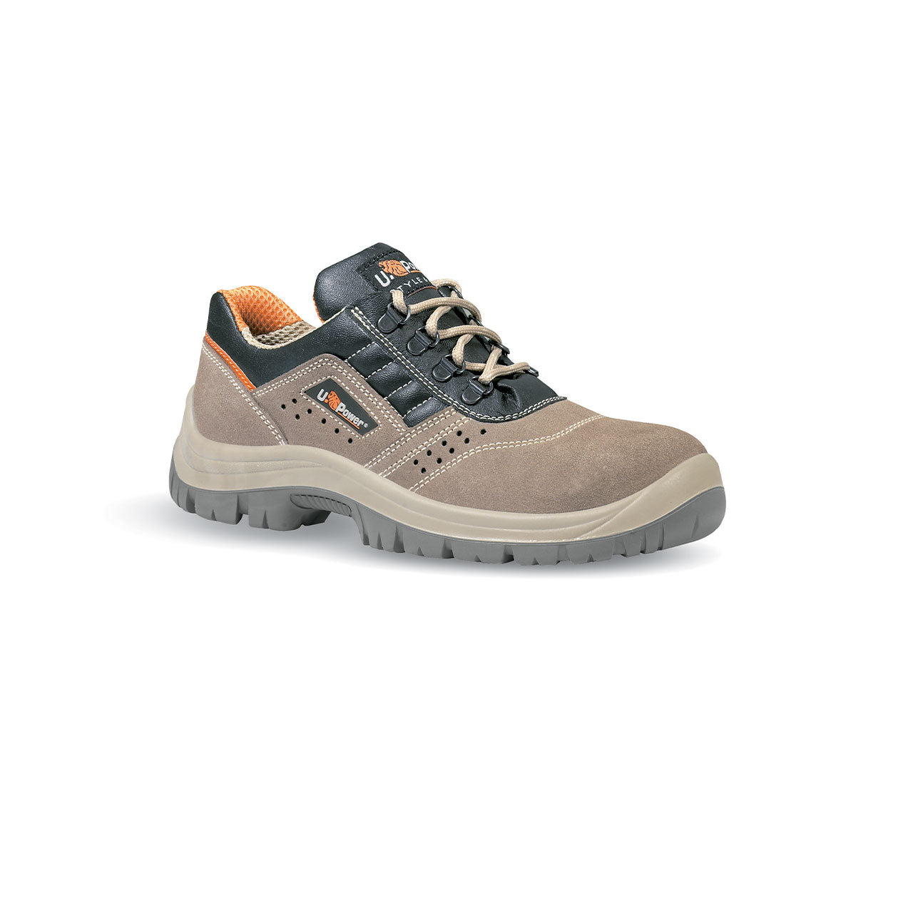 Scarpe antinfortunistiche basse, classiche e robuste u power della linea Style&Job, con tomaia in pelle scamosciata forata, puntale in acciaio, antiperforazione, antiscivolo, lamina in acciaio ergonomica e suola PU/PU, S1P SRC
