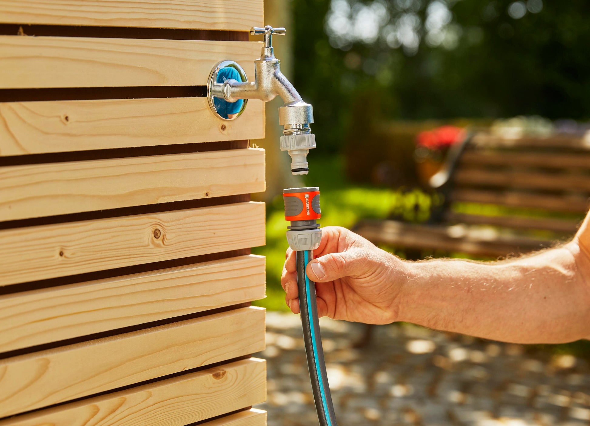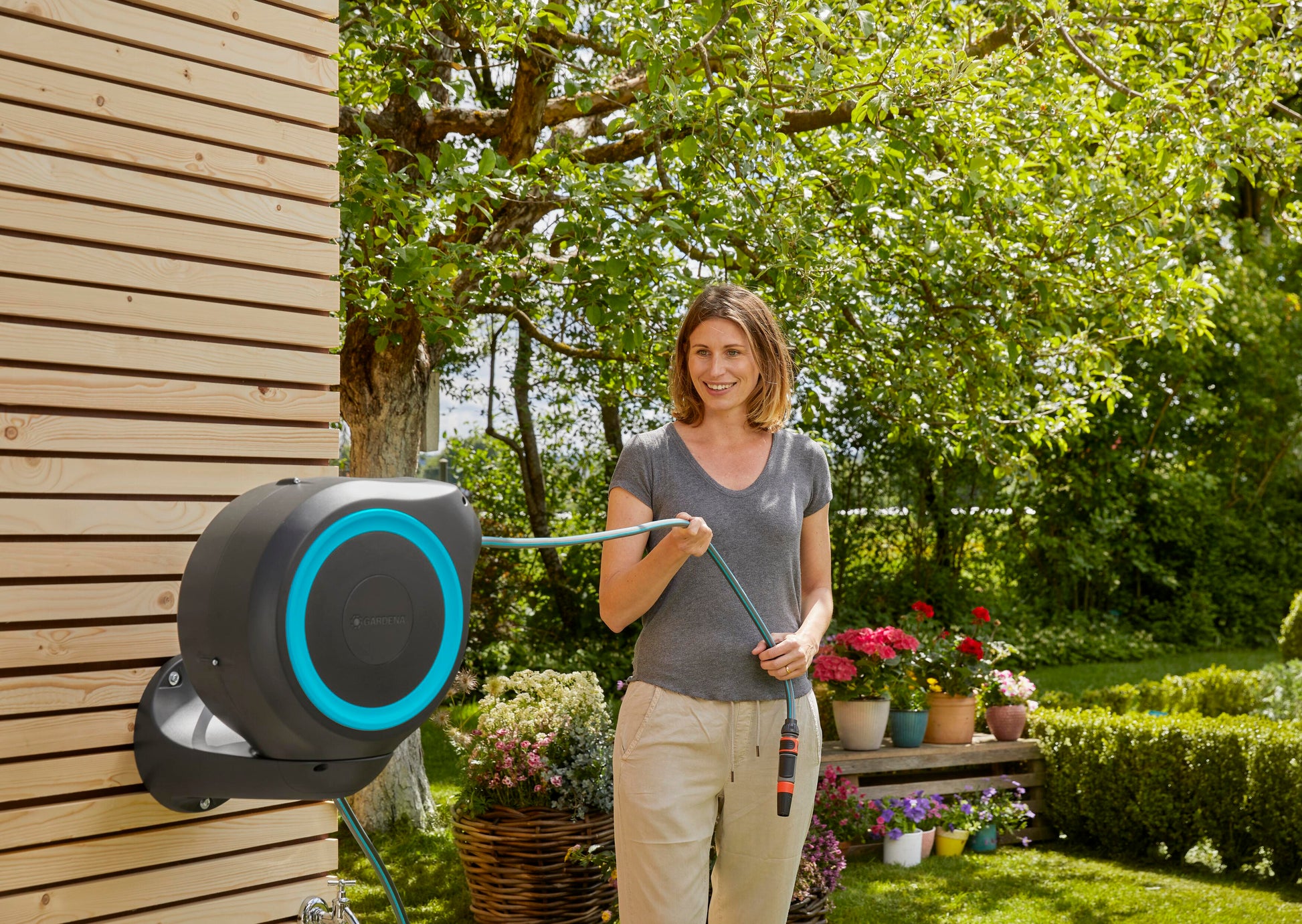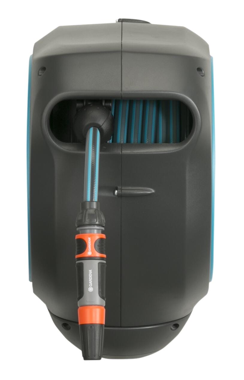 Innaffiare il giardino è più comodo che mai con l'Avvolgitubo a parete RollUp S. Aiuta a mantenere il vostro giardino in ordine, organizzato e previene fastidiosi pericoli di inciampo causati da un tubo in giro. Il pratico avvolgitubo viene semplicemente montato sulla parete di casa e collegato al rubinetto con un tubo flessibile. Grazie al robusto supporto a muro, l'avvolgitubo può essere ruotato di oltre 180°, in modo da poter raggiungere senza fatica ogni angolo del vostro giardino. Per l'uso diretto, basta allungare il tubo da giardino fino a una lunghezza massima di 15 metri. Il tubo da giardino si blocca automaticamente a intervalli particolarmente brevi non appena ci si ferma, il che significa che il tubo è semplice e facile da maneggiare. Una leggera trazione sull'estremità del tubo rilascia il blocco e una molla in acciaio integrata con l'innovativa tecnologia RollControl assicura una retrazione fluida e controllata. Il RollControl protegge la scatola del tubo e l'ambiente circostante dai danni causati da un avvolgimento troppo veloce. Per evitare piegature o nodi nel tubo dell'acqua, la cassetta ha una guida integrata per il tubo. Grazie agli attacchi per tubi e rubinetti dell'Original GARDENA System è possibile collegare in modo semplice e flessibile una prolunga o un altro elemento GARDENA compatibile al tubo. È possibile avere sempre a portata di mano gli accessori per tubi GARDENA. Possono essere fissati sotto il supporto a muro e possono essere riposti lì per risparmiare spazio. Il portagomma a muro GARDENA è resistente ai raggi UV e al gelo e può essere collocato sul muro di casa tutto l'anno senza problemi. Il materiale di alta qualità offre una lunga durata e un utilizzo senza manutenzione. Inoltre, l'avvolgitubo non può essere rubato grazie alla sicura protezione antifurto e può essere rimosso dalla parete solo da voi. Insieme all'avvolgitubo a muro riceverete il supporto a muro, un tubo flessibile di collegamento, tutti i necessari componenti Original GARDENA System e di montaggio e una lancia con due diversi tipi di getto. Questo prodotto di alta qualità ha una garanzia di cinque anni da parte di GARDENA. Un'irrigazione sempre pronta all'uso con il portagomma a muro RollUp S GARDENA.