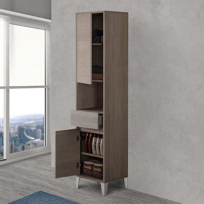 Colonna Armadio Portasciugamani a terra in legno melaminico colore rovere scuro con 2 ante con sistema slow motion per una chiusura ottimale, 2 ripiani interni removibili e regolabili, 1 cassetto con sistema soft-close e vano a giorno, con 4 piedini in ABS silver.