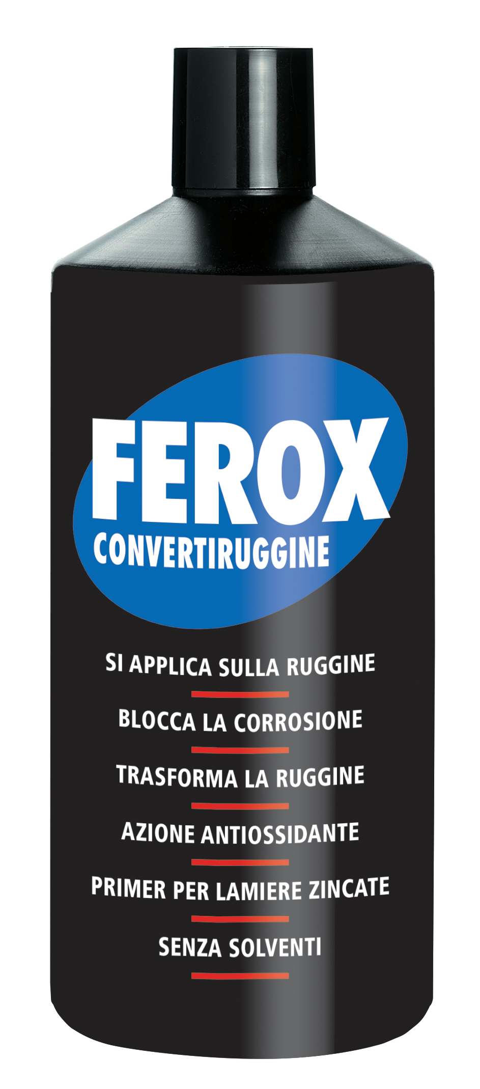 Prodotto per il trattamento della ruggine e per la protezione di tutte le superfici ferrose: arrugginite, nuove, verniciate e non. Pratico beccuccio dosatore. Pronto all'uso, facile e rapido da usare, resa elevata. Bassissima tossicità, Ferox è a base di resine sintetiche disperse in acqua e non contiene solventi: applicabile anche in ambienti chiusi o poco ventilati. Reagisce chimicamente con la ruggine, trasformandola in un complesso stabile, di colore nero, che una volta sovraverniciato resiste all'attacco degli agenti atmosferici ed è impermeabile all'umidità. Efficace anche su zone verniciate o su manufatti non arrugginiti, dove forma uno strato trasparente. Sovraverniciabile con qualsiasi tipo di vernice, all'acqua o al solvente. MODALITA' D'USO: Eliminare eventuale ruggine a scaglie. Non applicare il prodotto a temperature inferiori a 5°C, o in eccessiva umidità. Versare la quantità necessaria di prodotto in un recipiente di plastica. Non riversare l'eventuale prodotto non utilizzato nel contenitore originale. Sovraverniciare le superfici trattate entro 24/36 ore dall'applicazione. SPECIFICHE DI UTILIZZO: Resa teorica a pennello 15-20 mq. Essiccazione a 20°C. Asciutto al tatto in 15'/30'. Intervallo di tempo fra le 2 mani: 15'/30'. Sovraverniciabile con lo smalto di finitura dopo 12 ore ed entro 24/26 ore dall'applicazione.