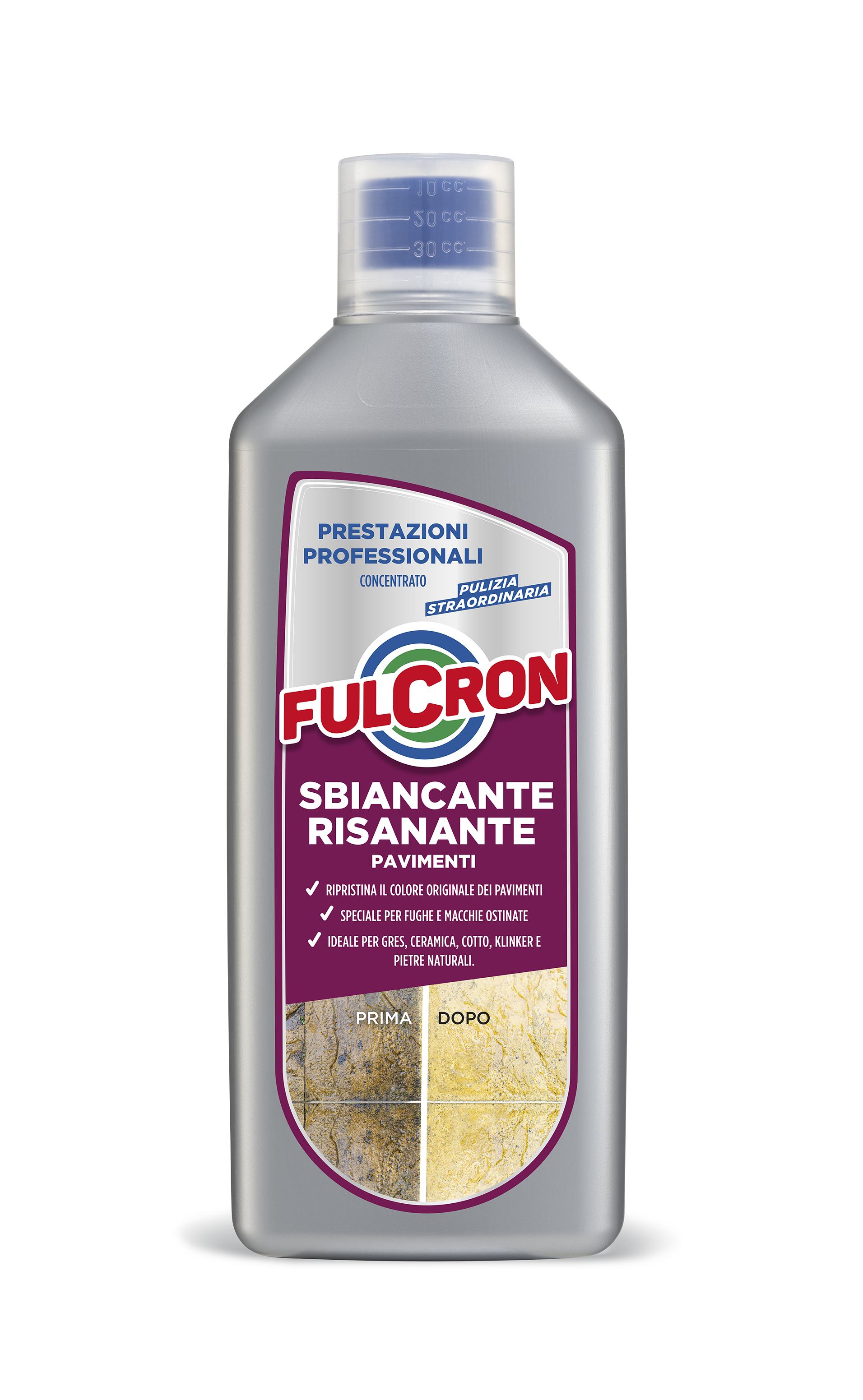 È un detergente fortemente alcalino, privo di cloro, con speciale azione sbiancante e risanante. Specificatamente studiato per la pulizia di pavimenti in cotto, pietra, klinker, gres, cementi, graniglie. Indispensabile per eliminare grigiori, macchie e annerimenti da pavimenti e fughe, ripristinando l’aspetto naturale del pavimento. Rimuove ogni tipo di sporco come depositi di grasso, vecchi o errati trattamenti permanenti con cere polimeriche. Si consiglia l’utilizzo almeno una volta l’anno per preservare il colore naturale delle fughe e dei pavimenti. Utile come neutralizzante in abbinamento a Fulcron Disincrostante Concentrato nelle operazioni di fine cantiere.