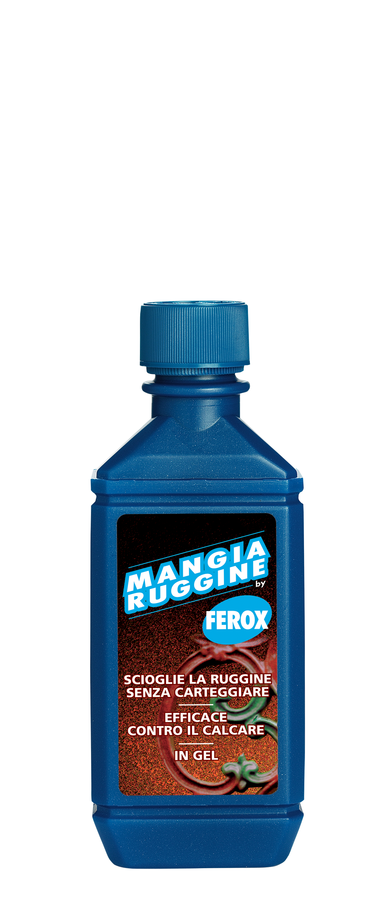 Ferox Mangiaruggine dissolve chimicamente la ruggine da metalli ferrosi e superfici cromate o zincate. A base di acidi inorganici e liquidi detergenti. Ottimo trattamento preparatorio prima dell'applicazione della vernice di finitura o, meglio, di un fondo antiruggine. Altissima resa. In gel, non cola. Di facile applicazione anche su superfici cromate o zincate aggredite dalla ruggine in modo da eliminare sia la ruggine che i residui di zincatura e cromatura. Non evapora, non teme il gelo.