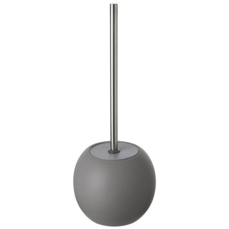 Portascopino WC da appoggio realizzato in ceramica di colore grigio a forma di sfera.
