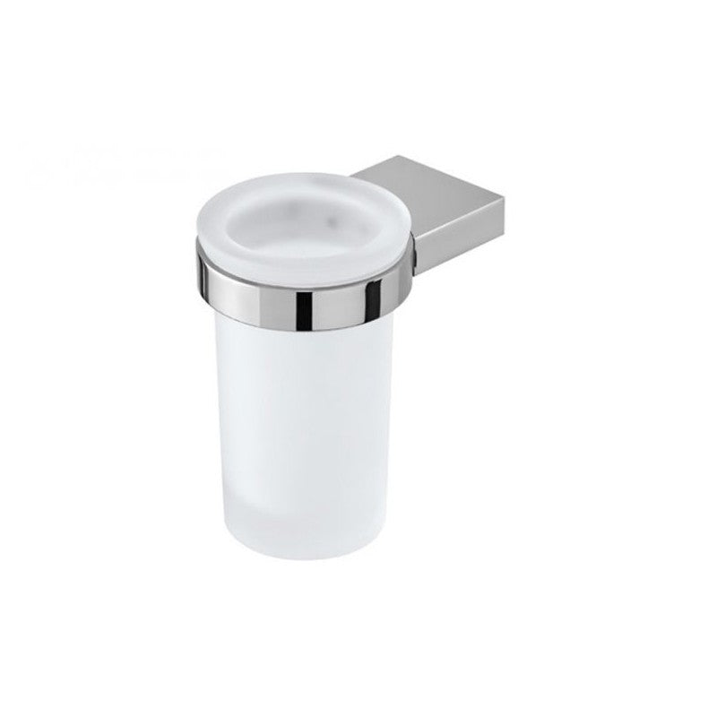 Porta spazzolini con bicchiere in vetro satinato e struttura in acciaio cromato.
