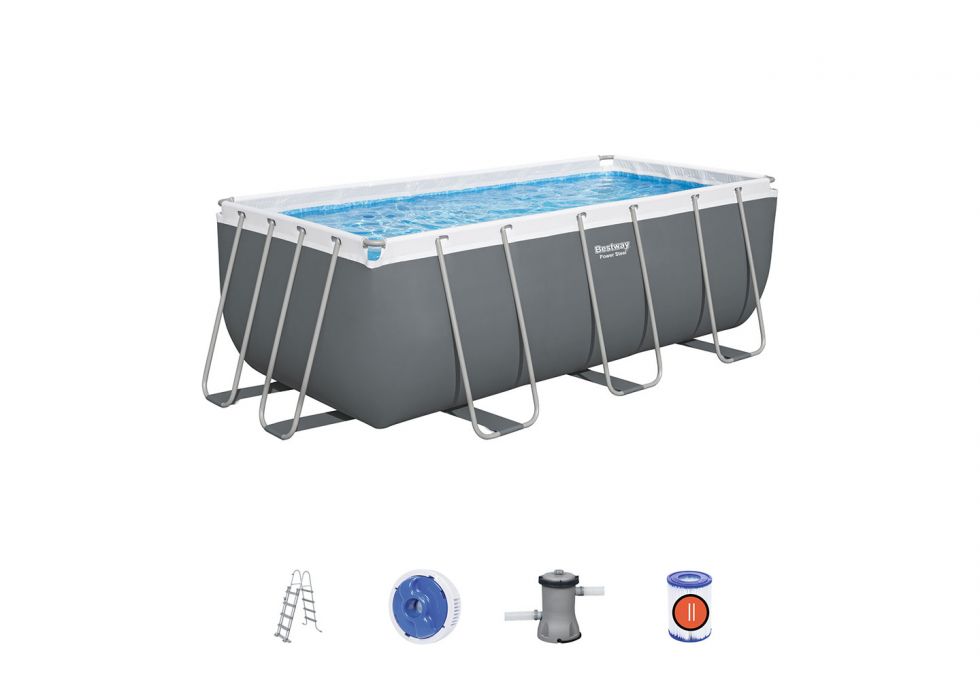Nella confezione troverai: piscina, pompa di filtraggio a cartuccia, scaletta di sicurezza, dosatore cloro ChemConnect, toppa di riparazione.