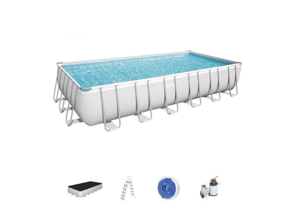 La confezione include: piscina, pompa filtro a sabbia, scaletta di sicurezza, telo di copertura, dosatore cloro ChemConnect e toppa di riparazione.