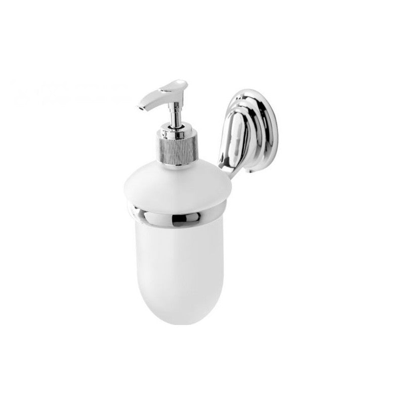 Portadispenser per sapone liquido in acciaio cromato e dosatore in vetro bianco opaco.