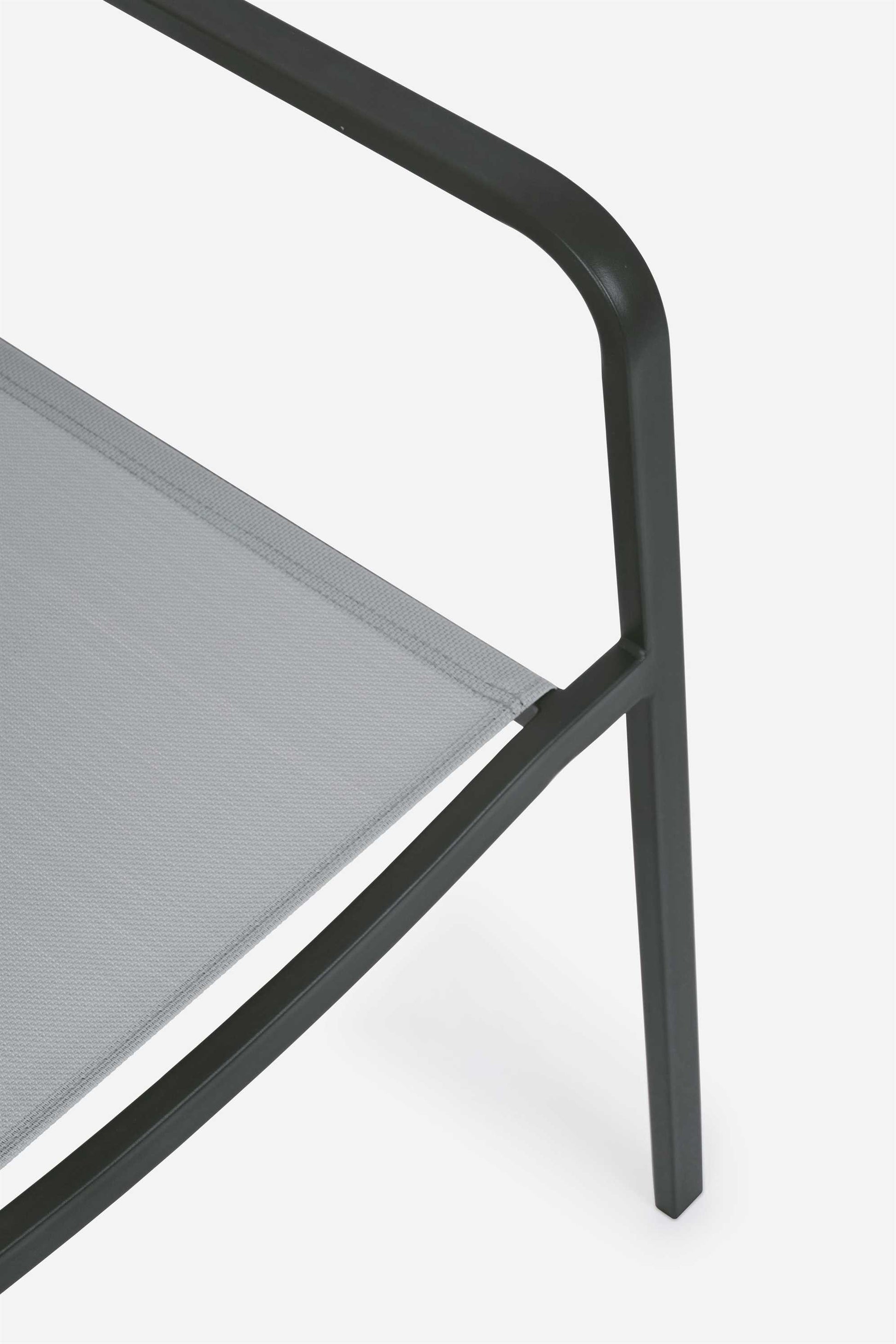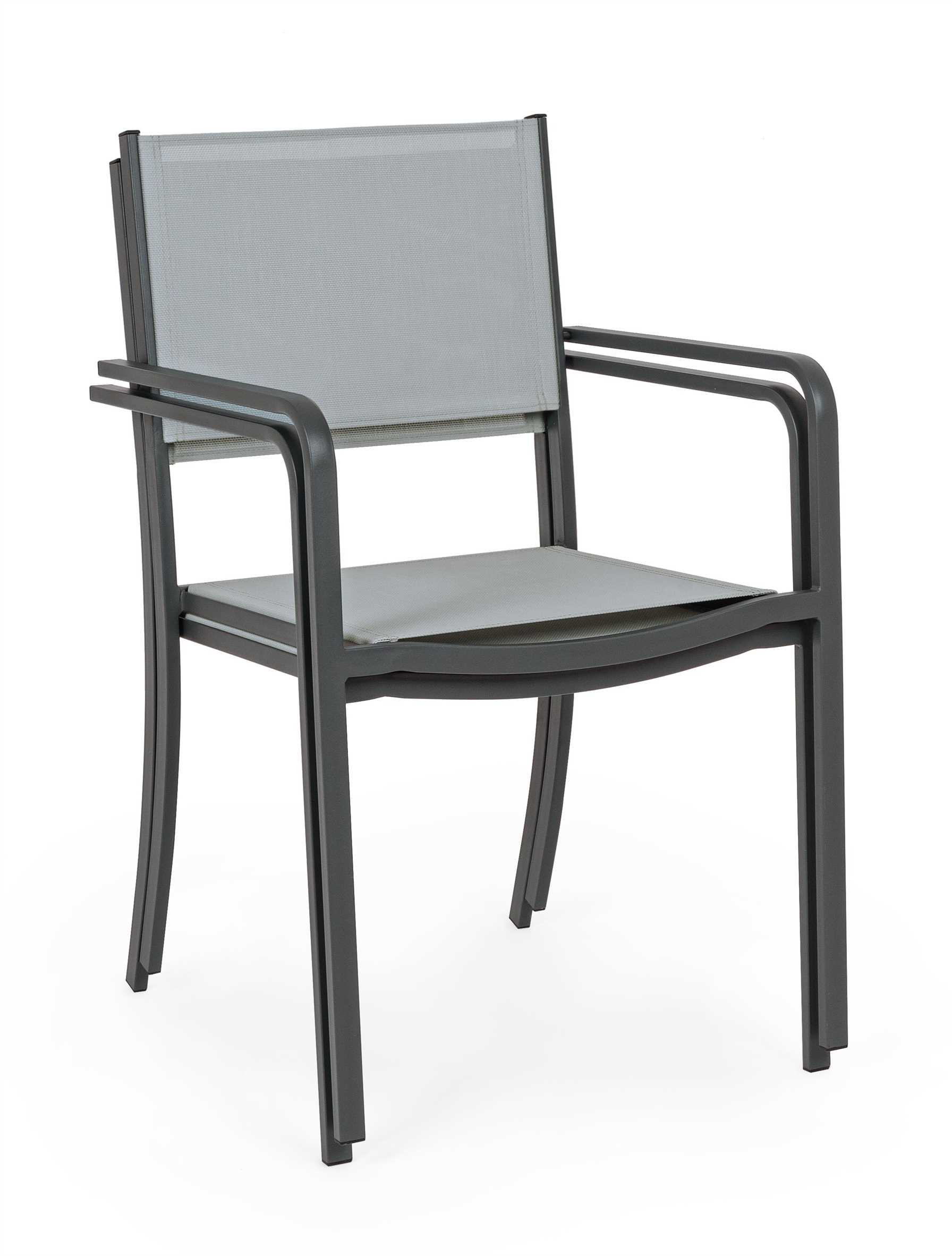 STRUTTURA IN ACCIAIO (TRATTATO PER ESTERNO TRAMITE FOSFATAZIONE) VERNICIATO A POLVERE (POLIESTERE), SEDUTA E SCHIENALE IN TEXTILENE 2X1. IMPILABILE. IMBALLO SENZA CARTONE.