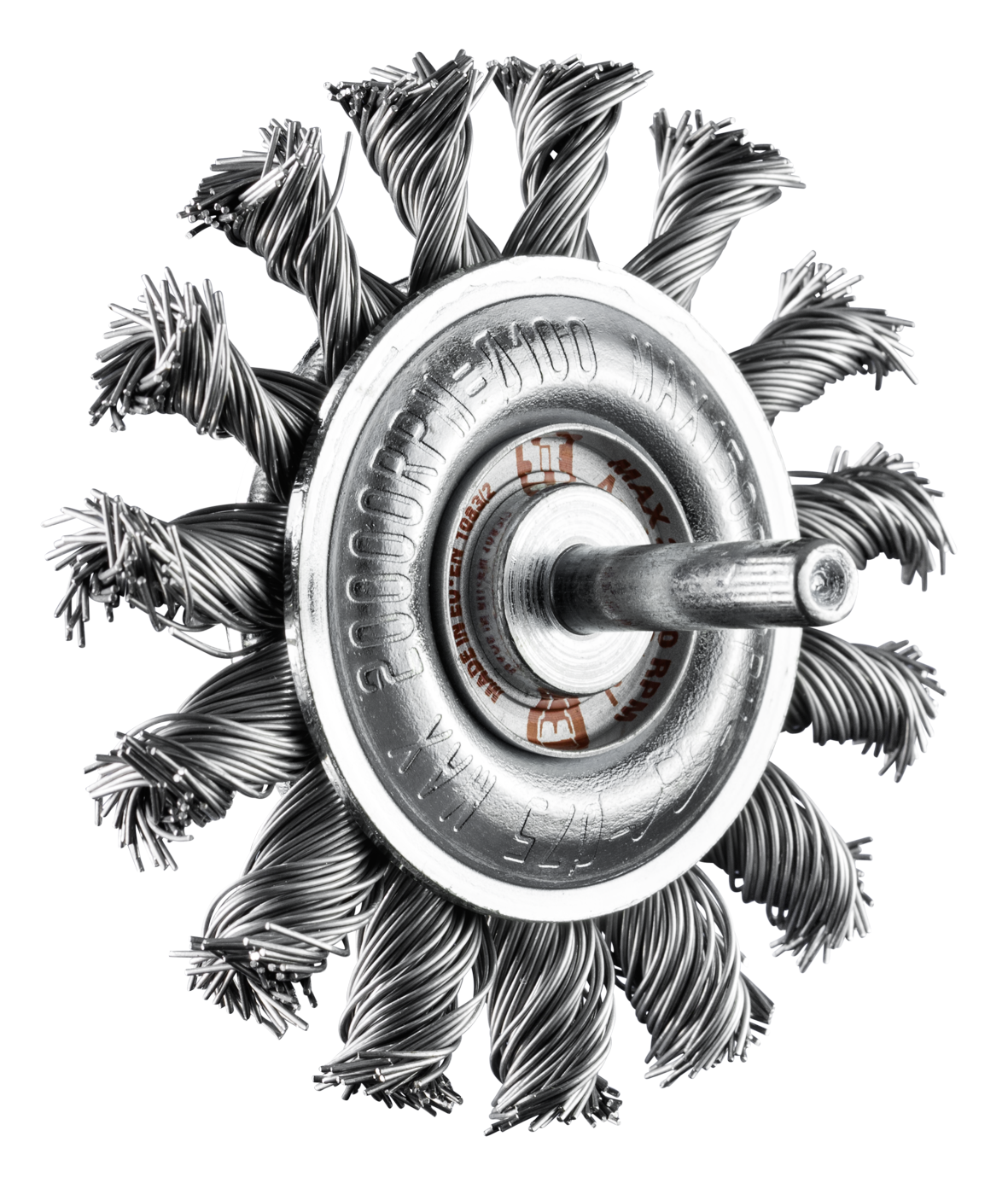 SPAZZOLE CIRCOLARI CON GAMBO, IN ACCIAIO AD ALTA RESISTENZA. AGGRESSIVE GRAZIE AI MAZZETTI RITORTI. UTILI PER LA RIMOZIONE DI SCORIE, RUGGINE E RESIDUI DA OGNI TIPO DI SUPERFICIE.