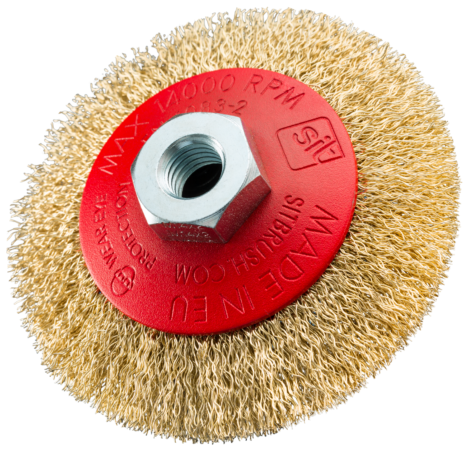 Spazzola conica con foro filettato MA14 F. Fili acciaio ondulati ottonati mm 0,30 Ø mm 90/120 Altezza fili mm 20/22.Adatta per lavori su superfici irregolari