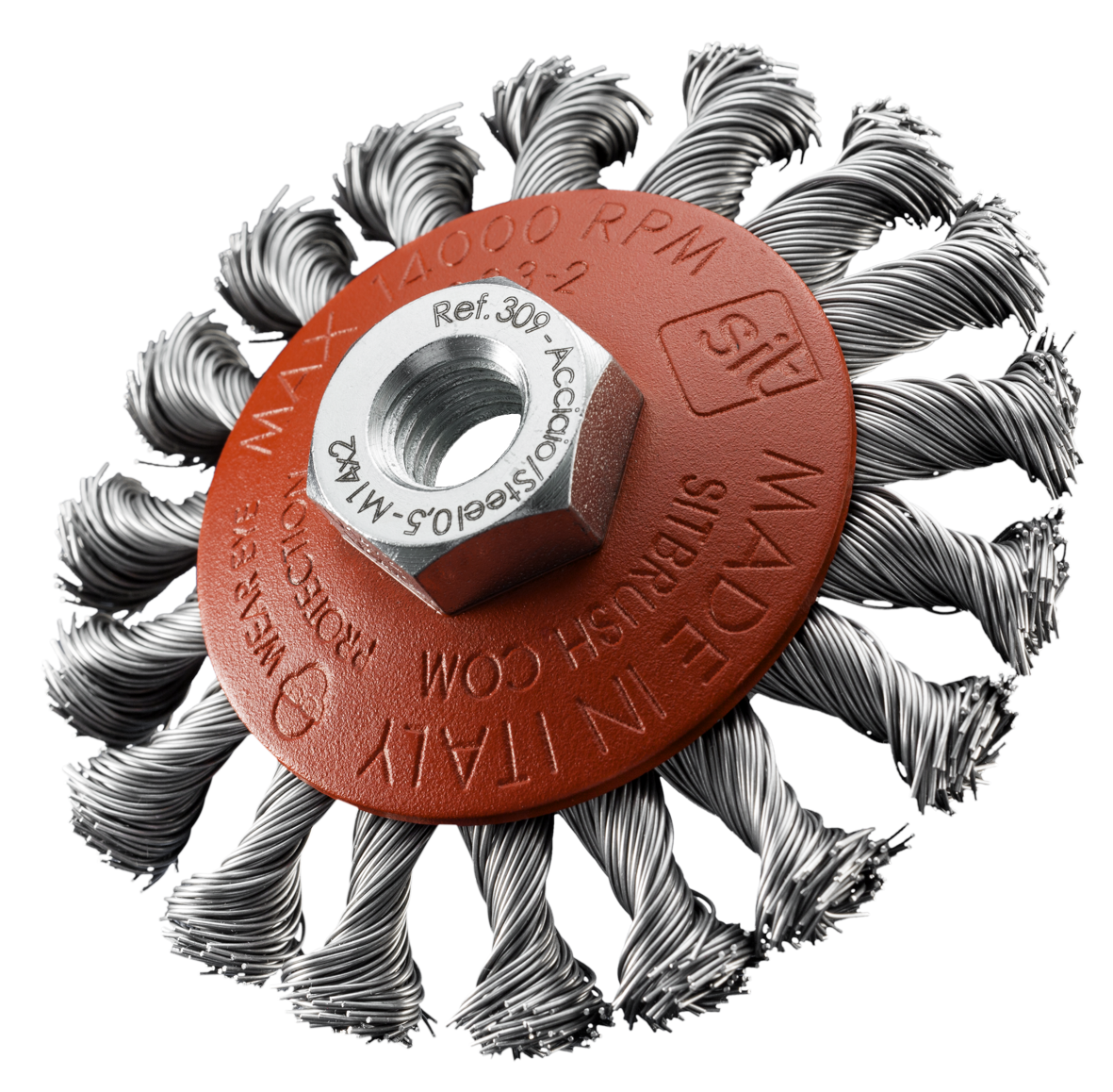 Spazzola conica con foro filettato MA14 F Fili acciaio ritorti mm 0,50 mazzetti 18 Diametro mm 95 Altezza fili mm 20 Adatta per lavori su superfici irregolari