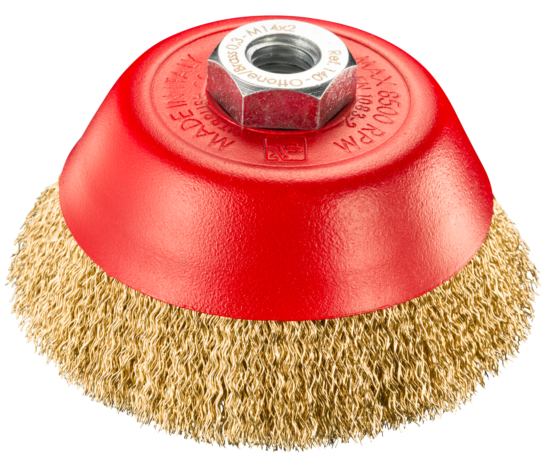 Spazzole in filo d’acciaio ottonato ondulato per la pulizia di superfici. La versione TE comprende spazzole a tazza più leggere.