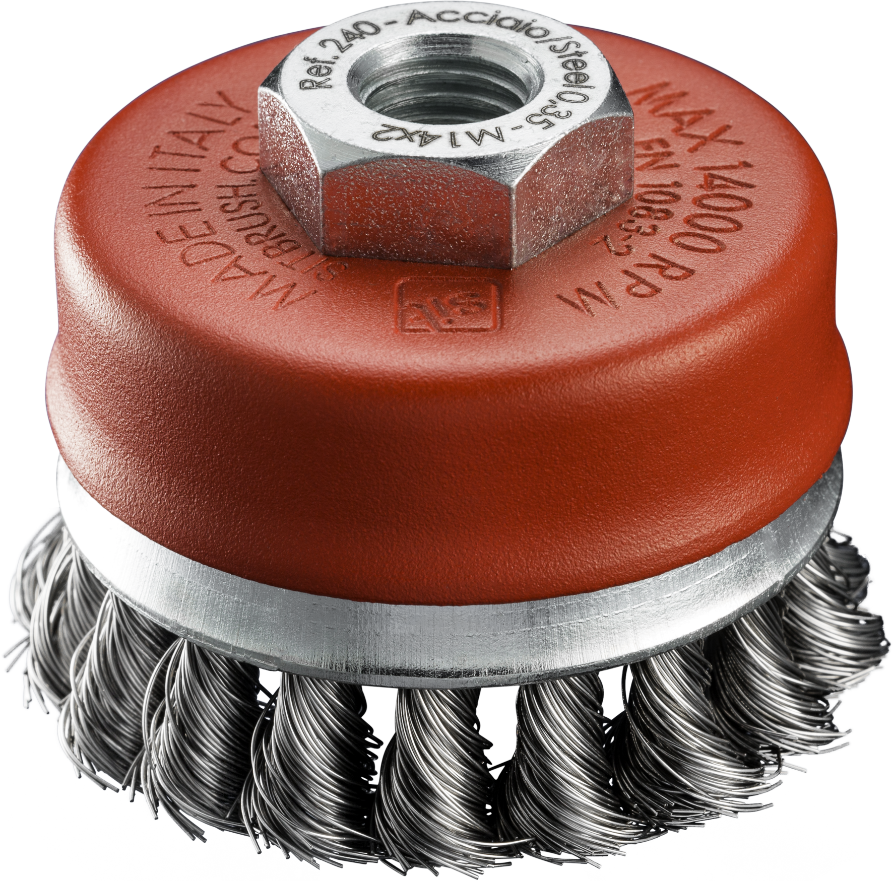 Spazzola a tazza con foro filettato MA14 F.Fili acciaio ritorti mm 0,35 mazzetti 18 Diametro mm 70 Altezza fili mm 17 Adatta per eliminazione scorie, ruggine, vernici