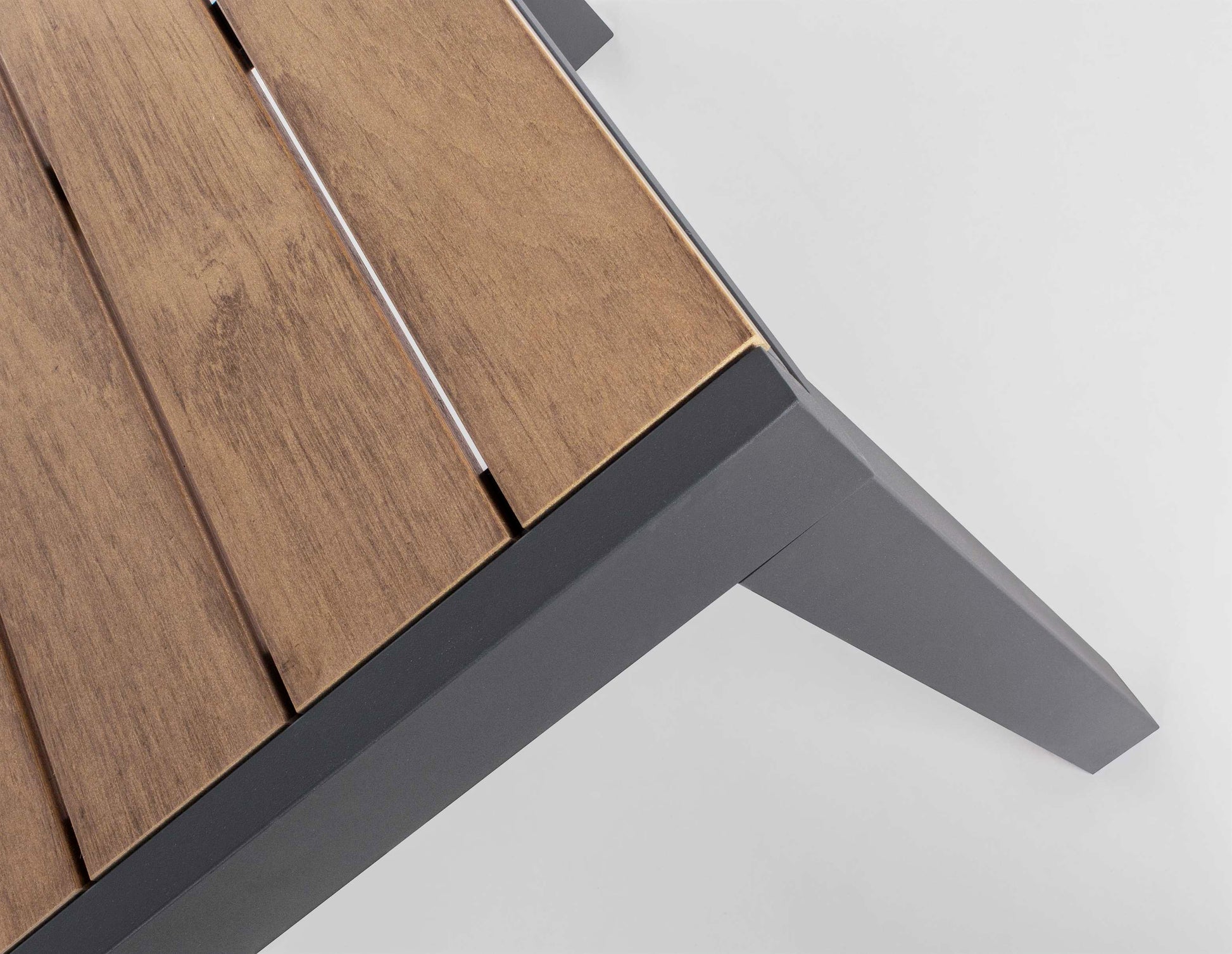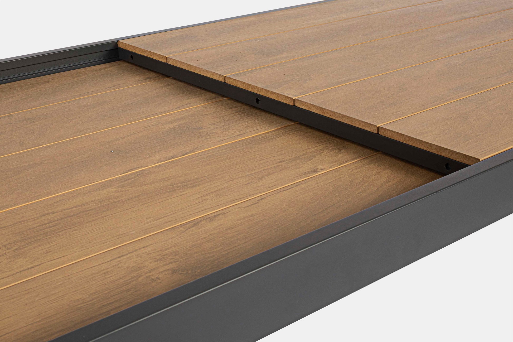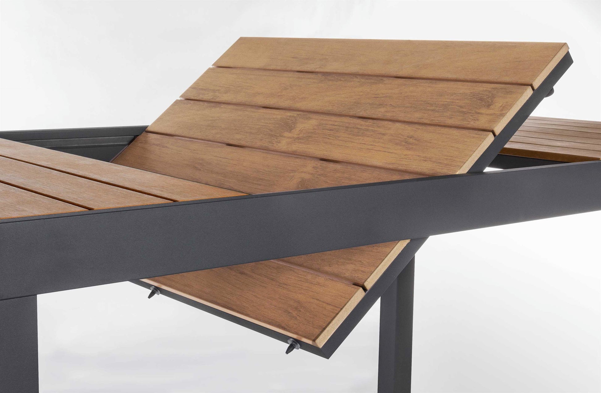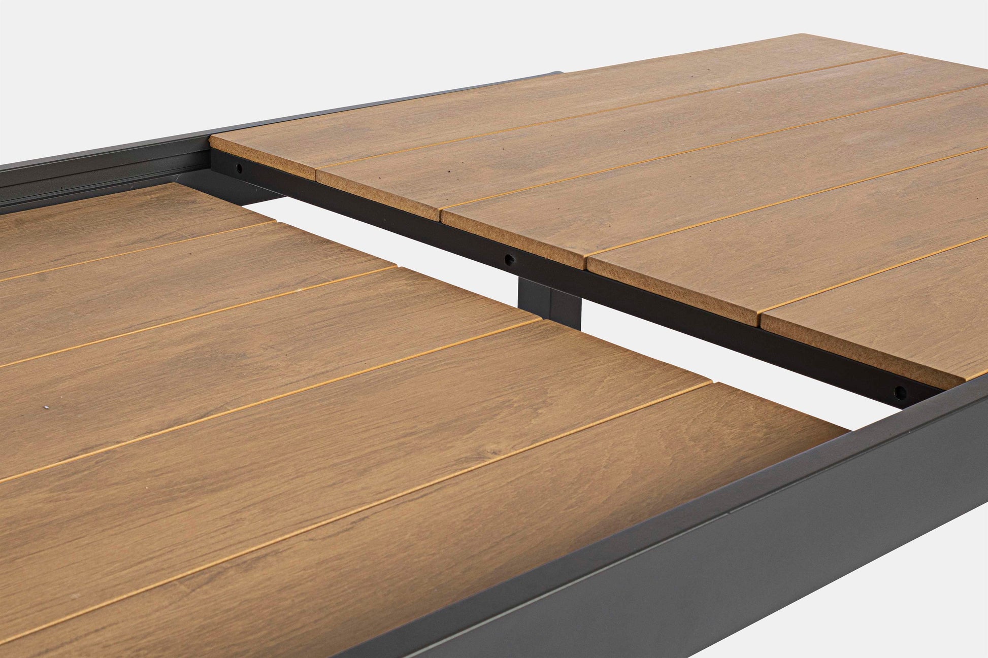 STRUTTURA IN ALLUMINIO VERNICIATO A POLVERE (POLIESTERE). PIANO IN POLYWOOD (MATERIALE COMPOSITO DALL'ASPETTO SIMILE AL LEGNO) 90% POLISTIRENE 10% SBS COLOR TEAK. PROLUNGA A SCOMPARSA. VITERIA IN ACCIAIO GALVANIZZATO. SI RACCOMANDA DI NON COPRIRE IL TAVOLO (PER TEMPI PROLUNGATI) CON MATERIALI CHE NON PERMETTONO IL RICIRCOLO D'ARIA (COME COPERTURE O TOVAGLIE IN PLASTICA/PVC). GAMBE DA ASSEMBLARE.