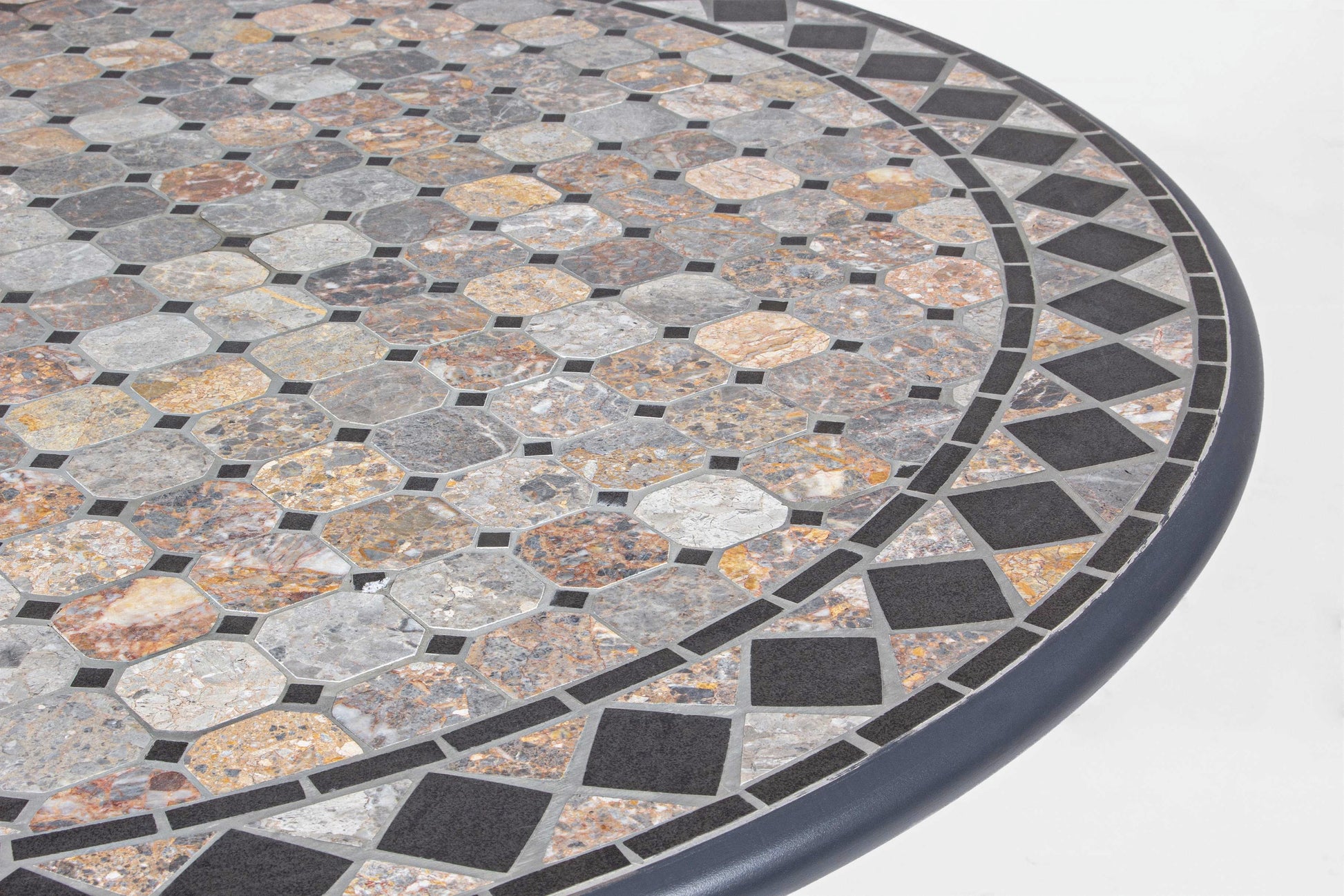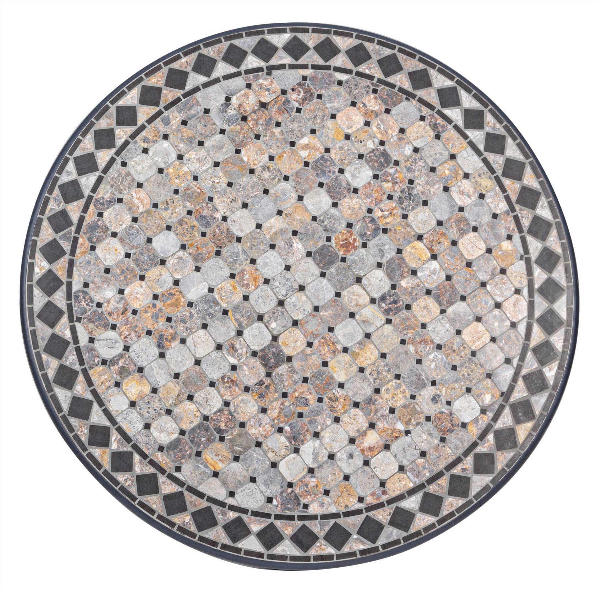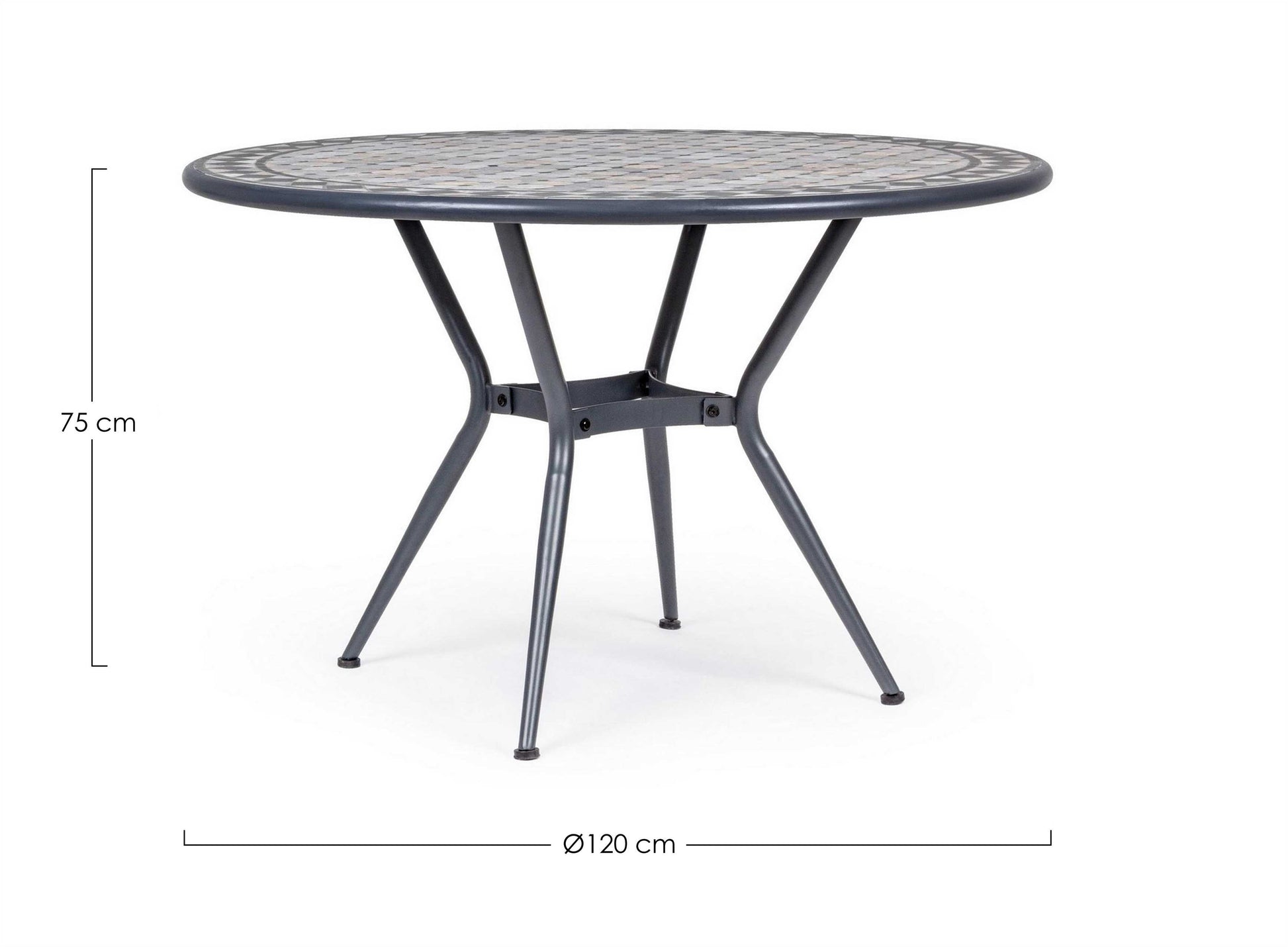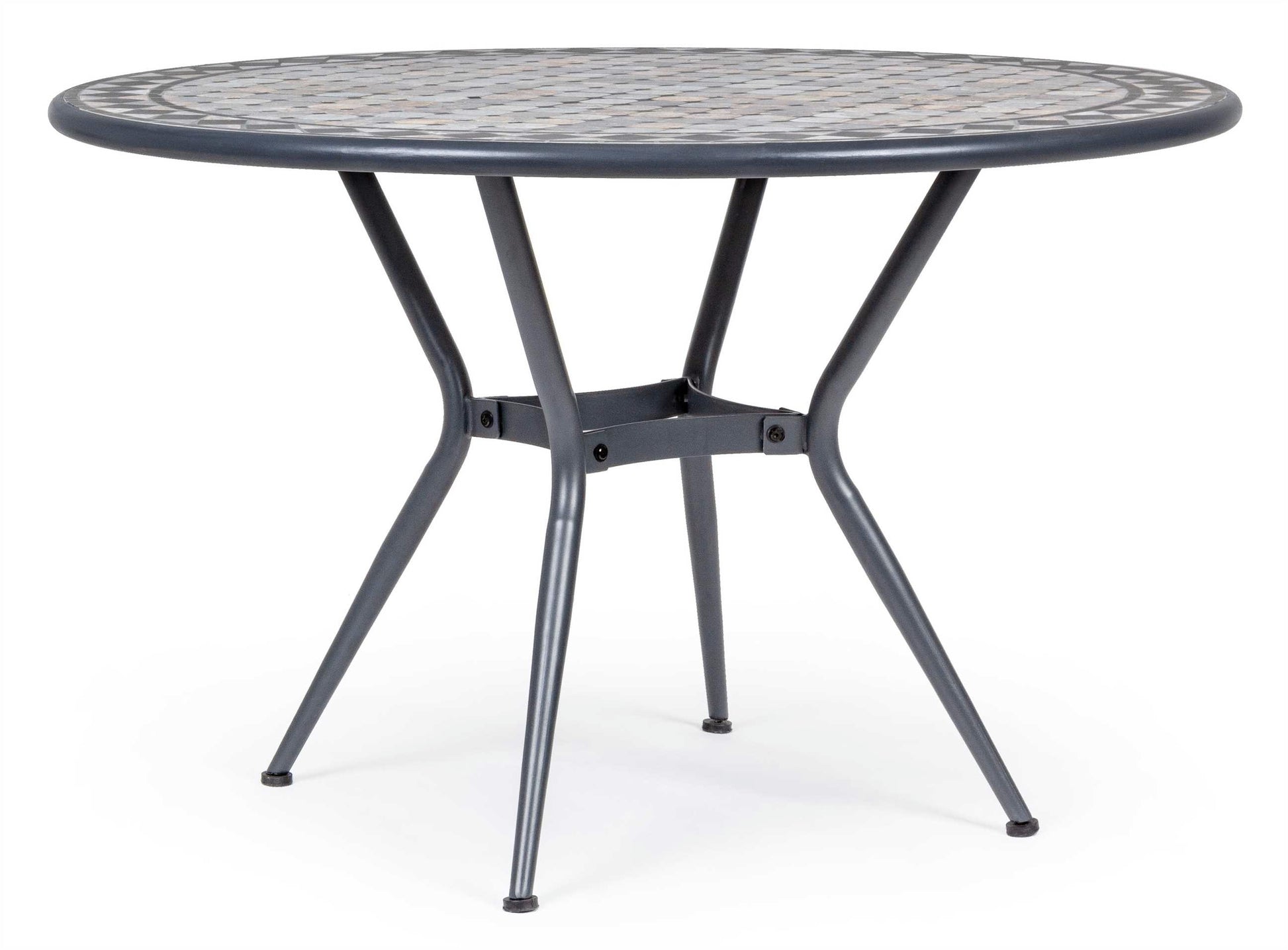 STRUTTURA IN ACCIAIO TRATTATO PER ESTERNO TRAMITE ZINCATURA E VERNICIATO A POLVERE (POLIESTERE). PIANO IN CERAMICA CON LAVORAZIONE A MOSAICO. GAMBE DA ASSEMBLARE.