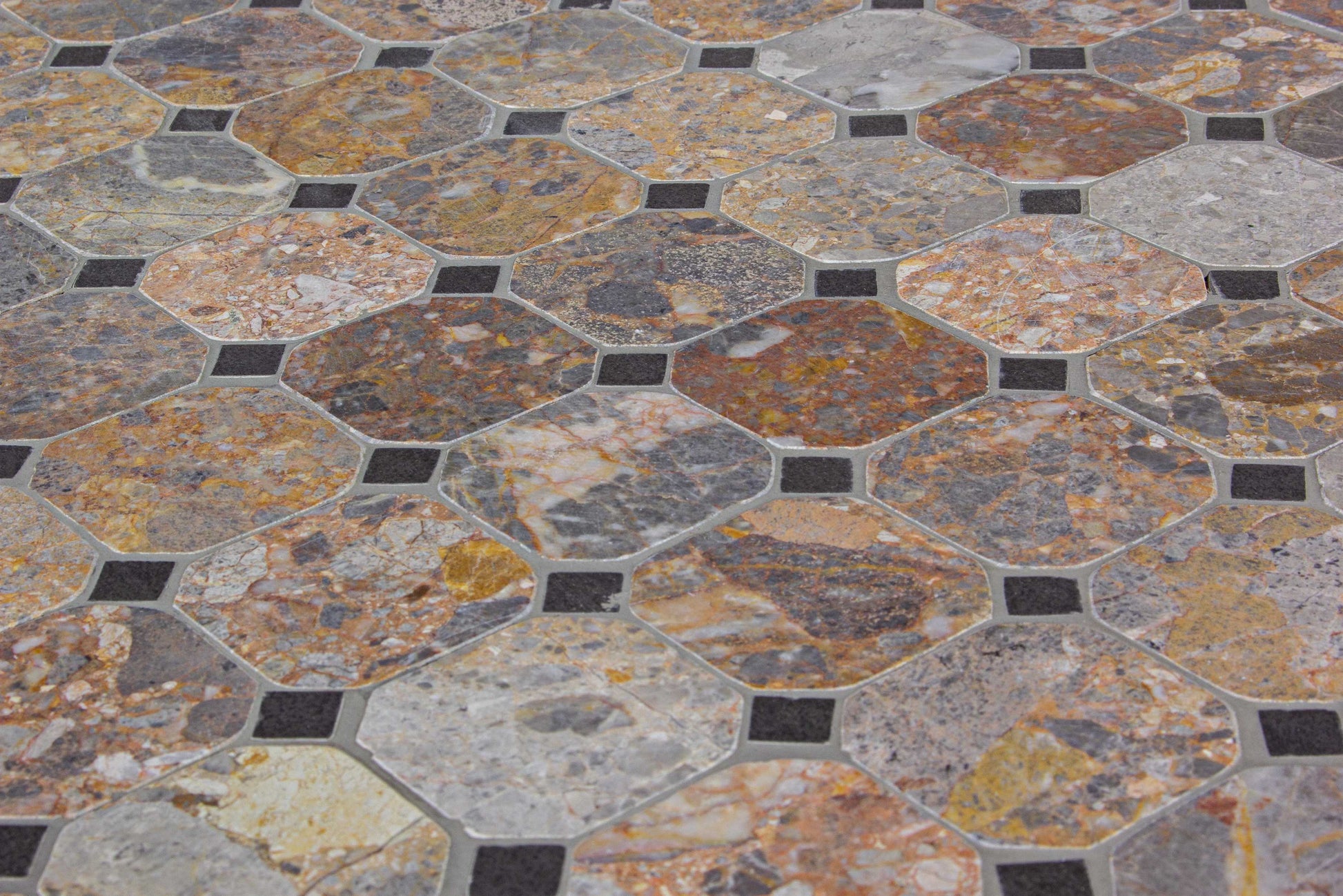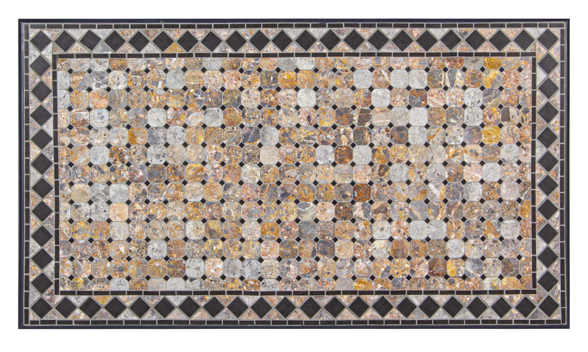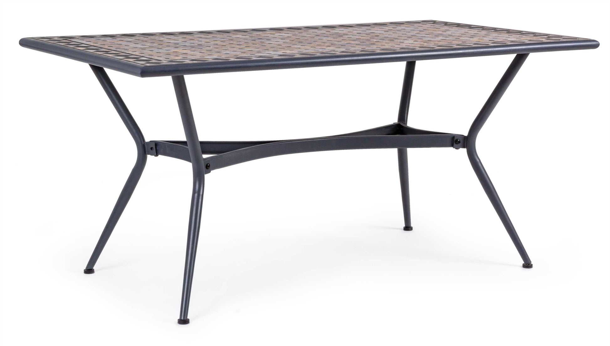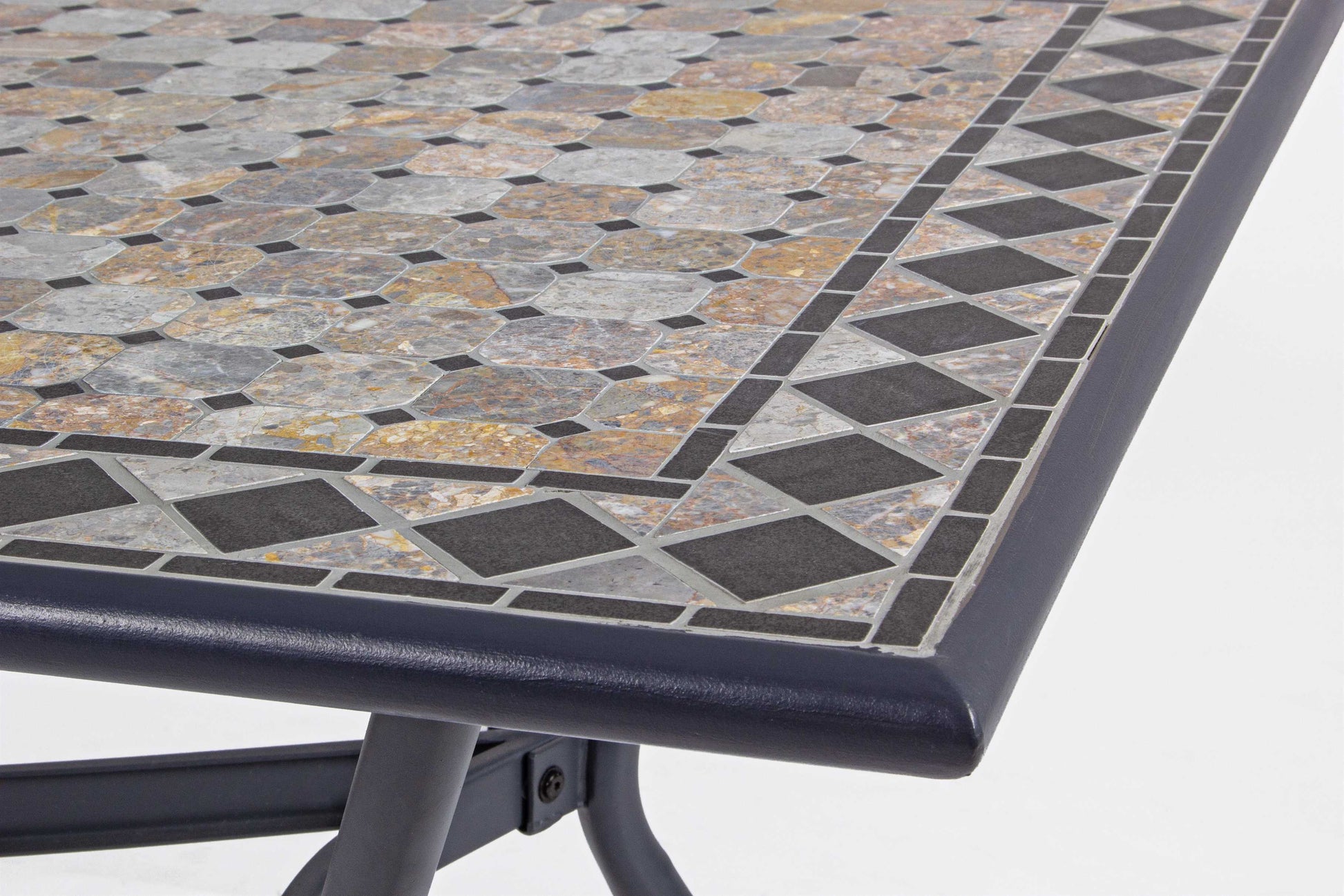 STRUTTURA IN ACCIAIO TRATTATO PER ESTERNO TRAMITE ZINCATURA E VERNICIATO A POLVERE (POLIESTERE). PIANO IN CERAMICA CON LAVORAZIONE A MOSAICO. GAMBE DA ASSEMBLARE.