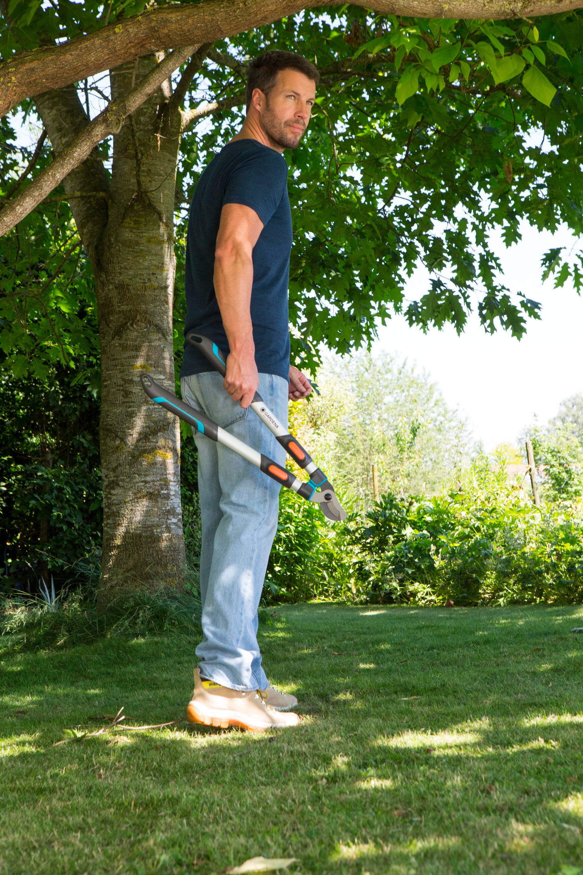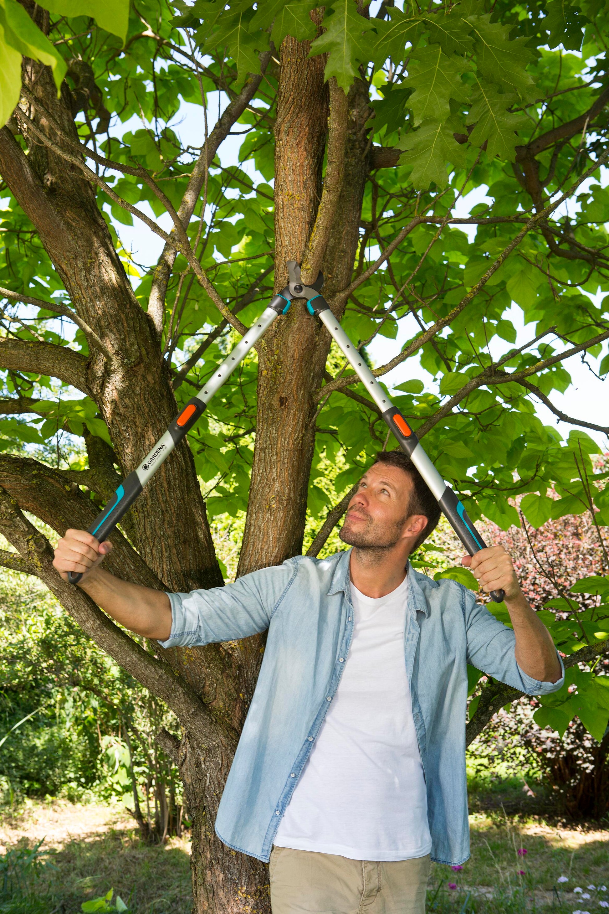 Il Troncarami TeleCut 650-900 B GARDENA è un modello bypass per tagliare il legno fresco. Grazie al suo peso ridotto e all'eccellente azione della leva, lo sforzo necessario per tagliare è minimo. La regolazione telescopica dei bracci, permette di tagliare i rami alti. Inoltre, gli ammortizzatori paracolpi in plastica proteggono le articolazioni. Le lame di precisione con rivestimento antiaderente garantiscono un taglio preciso e delicato sulle piante. 25 anni di garanzia.