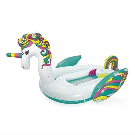 Goditi un'estate da favola con l'Isola gonfiabile a forma di Unicorno gigante di Bestway ! Grande abbastanza per supportare 6 persone, questo enorme unicorno gonfiabile è dotato di 8 portabicchieri, un secchiello per il ghiaccio e due schienali super ampi. Non appena ti accomoderai su questa leggendaria creatura, non potrai che rilassarti – il gonfiabile presenta una corda avvolgente, delle maniglie super resistenti e una piattaforma per salire più facilmente sull'isola. Inoltre, le valvole a rilascio rapido rendono il gonfiaggio e lo sgonfiaggio un gioco da ragazzi. L'isola gonfiabile a forma di unicorno gigante sarà un successone in piscina, sul lago, sul fiume o nell'oceano!