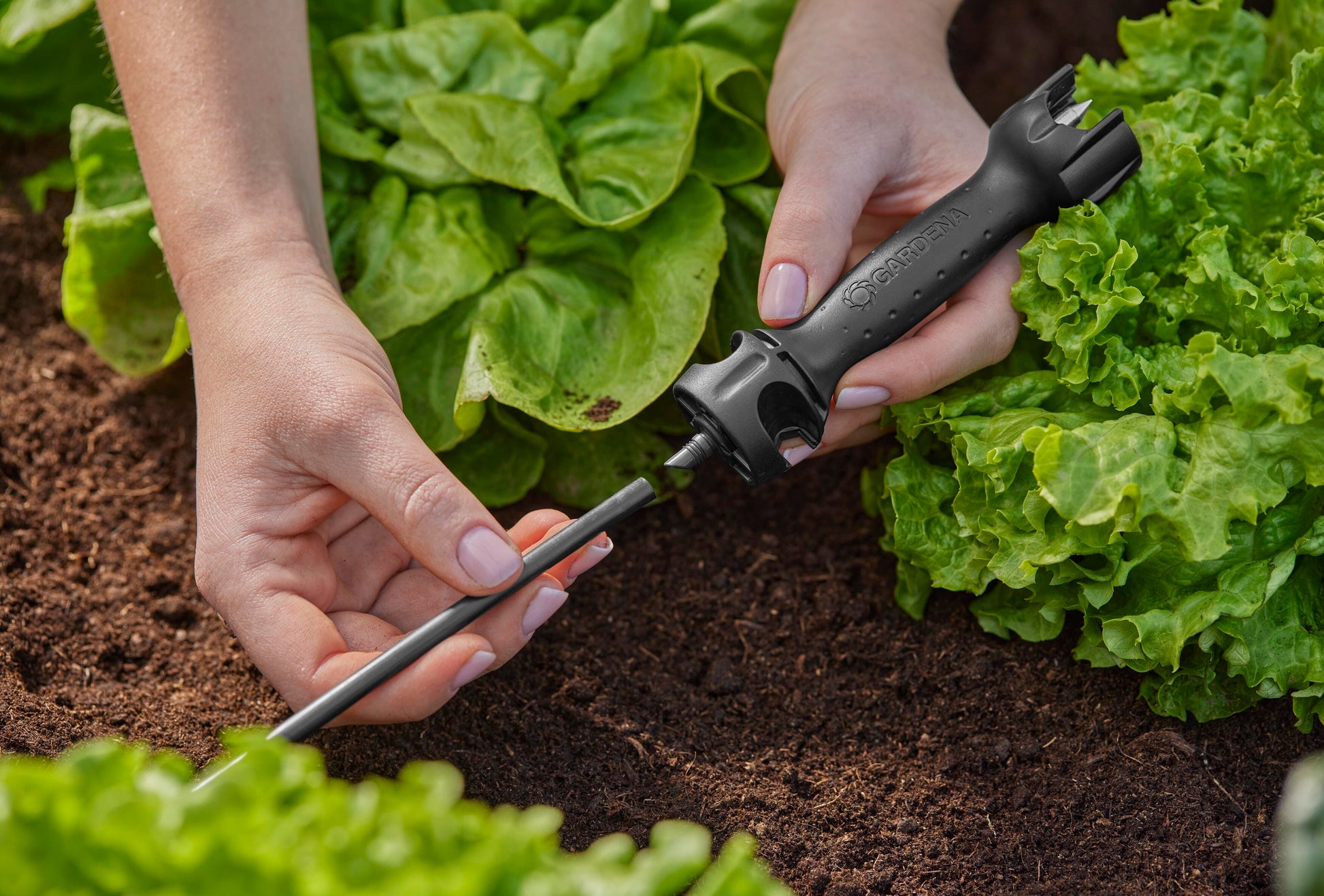 L'utensile di montaggio GARDENA è un accessorio ideale per il Micro-Drip-System. È perfetto per tutte le operazioni di installazione, manutenzione e modifica di un impianto Micro-Drip-System. L'attrezzo di montaggio è particolarmente versatile grazie a sette diverse funzioni. La punta robusta e di lunga durata permette la perforazione precisa e semplice dei tubi di linea da 13 mm. A fori effettuati, i gocciolatori, i microspruzzi o i tappi terminali possono essere comodamente avvitati al tubo di linea con questo utensile. Grazie all'impugnatura ergonomica, si adatta comodamente alla mano. Utilizzando questo utensile, è inoltre facile avvitare i componenti del Micro-Drip-System, come i gocciolatori di fine linea, all'estremità del tubo di derivazione da 4,6 mm o i microspruzzi in un raccordo per microspruzzi. Inoltre, l'attrezzo di montaggio è adatto per avvitare e installare una prolunga per microspruzzi. In aggiunta è presente un supporto per aghi di pulizia che aiuta nell'attività di pulizia dei gocciolatori. L'attrezzo di montaggio GARDENA è un prodotto di qualità realizzato in Europa.