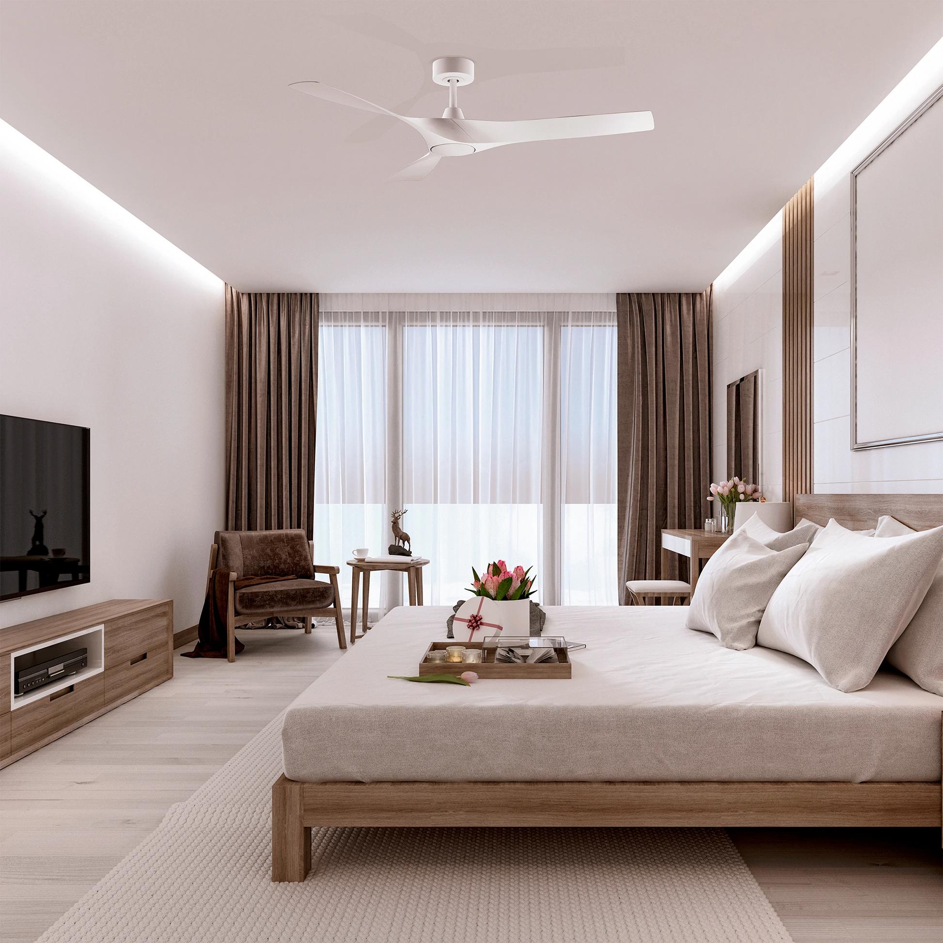 Ventilatore da soffitto AITANA con luce LED integrata e memoria della temperatura di colore. Presenta un corpo bianco e tre pale bianche che avvolgono il corpo, rendendolo facile da installare. È dotato di un motore DC (corrente continua) ad alta efficienza che riduce il consumo energetico creando un'atmosfera piacevole grazie al suo funzionamento silenzioso. Include un telecomando e un'APP per controllare e modificare le modalità di programmazione (2h-4h), la temperatura di colore (2.700K-4.000K-6.500K), le velocità (6), l'intensità luminosa (fino a 8 livelli), la modalità brezza (sensazione creata dalla variazione continua della velocità) e la modalità inverno-estate. Questo elegante modello può essere utilizzato in stanze di dimensioni superiori a 32 m²