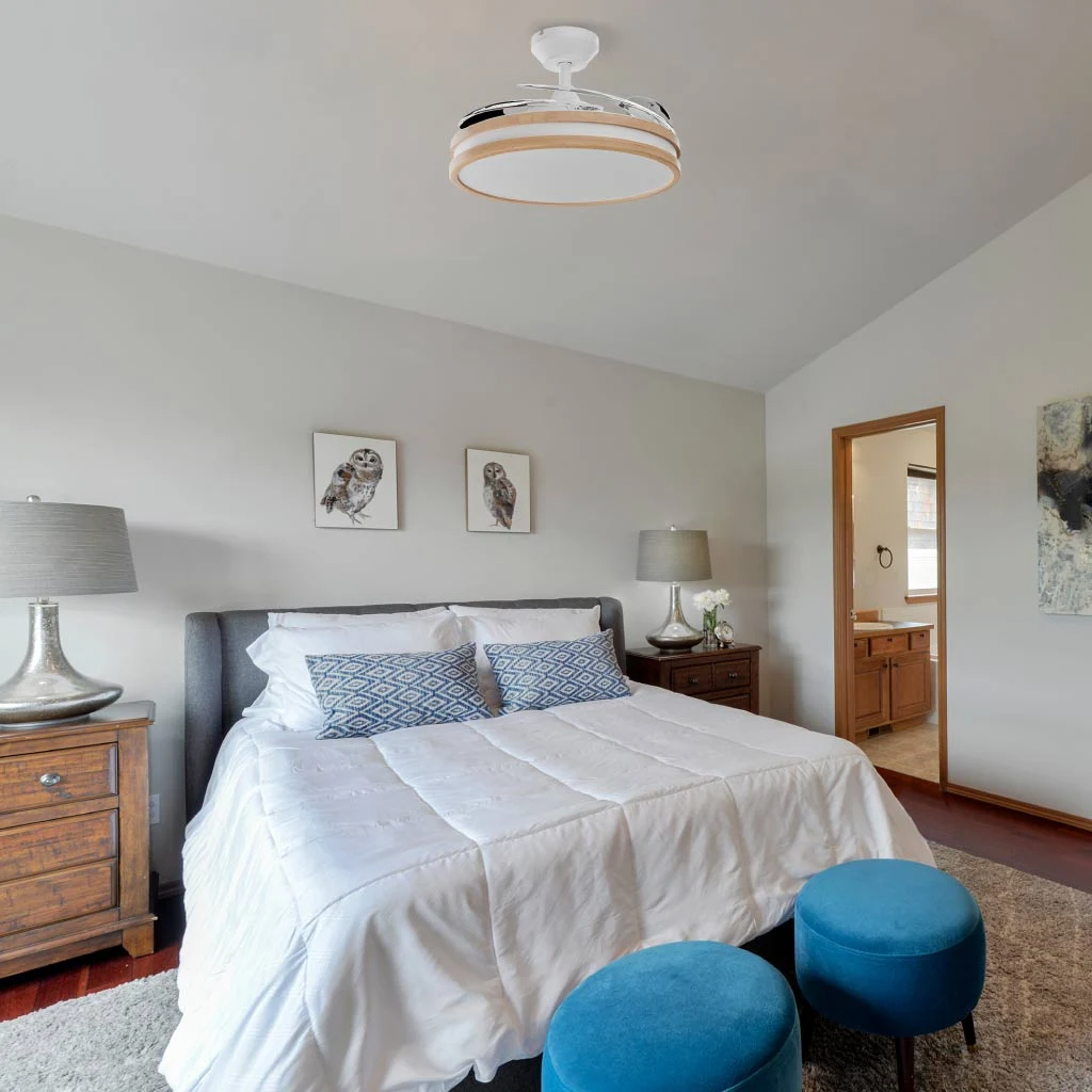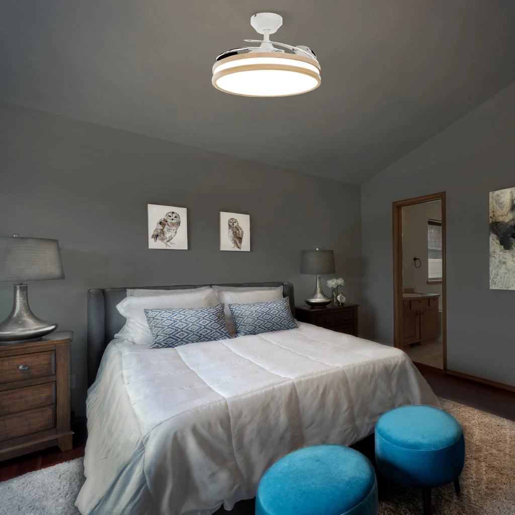 Ventilatore da soffitto MACA con pale retrattili o pieghevoli, la cui sorgente luminosa è un modulo LED integrato, con elevato flusso luminoso e memoria della temperatura di colore. Ha un corpo in legno e bianco e 4 pale retrattili trasparenti, è facile da installare. È dotata di un motore DC (corrente continua) ad alta efficienza che riduce il consumo energetico e genera un’atmosfera piacevole grazie al suo funzionamento silenzioso. Include un telecomando per controllare e modificare le modalità di programmazione (1h-2h-4h), la temperatura del colore (2.700K-4.000K-6.500K), le velocità (6), l’intensità della luce (fino a 8 livelli), la modalità brezza (sensazione creata dal continuo cambio di velocità) e la modalità inverno-estate. Questo elegante modello può essere utilizzato in stanze di dimensioni comprese tra 13m2 a 20m2.