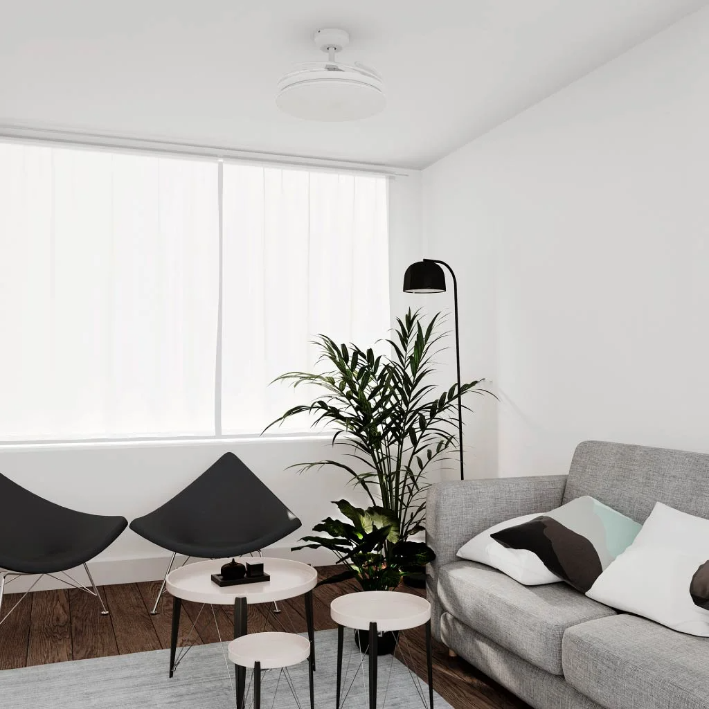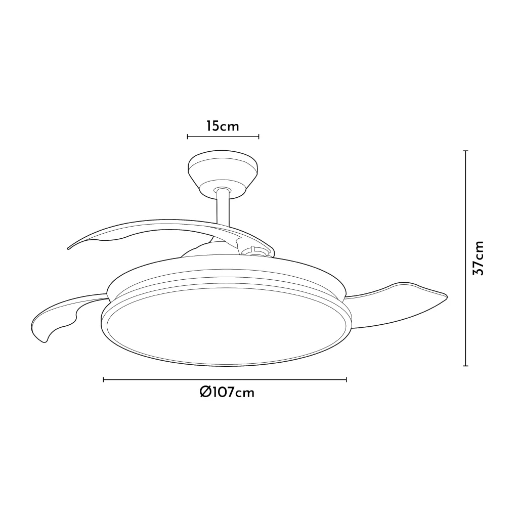 Ventilatore LIDIA ALTAVOZ con pale pieghevoli o retrattili e modulo luce LED integrato, elevato flusso luminoso e memoria della temperatura di colore. Ha un corpo bianco e 4 pale retrattili trasparenti, che ne facilitano l'installazione. È dotato di un motore DC (corrente continua) ad alta efficienza che riduce il consumo energetico creando un'atmosfera piacevole grazie al suo funzionamento silenzioso. Include un telecomando e un'APP per controllare e modificare le modalità di programmazione (1h-2h-4h), la temperatura di colore (3.000K-4.000K-6.500K), le velocità (6), l'intensità luminosa (fino a 8 livelli), la modalità brezza (sensazione creata dalla variazione continua della velocità) e la modalità inverno-estate. Questo elegante modello può essere utilizzato in ambienti di dimensioni comprese tra 13 m² e 20 m² . Include un altoparlante integrato e la modalità luce RGB può essere controllata tramite l'APP.